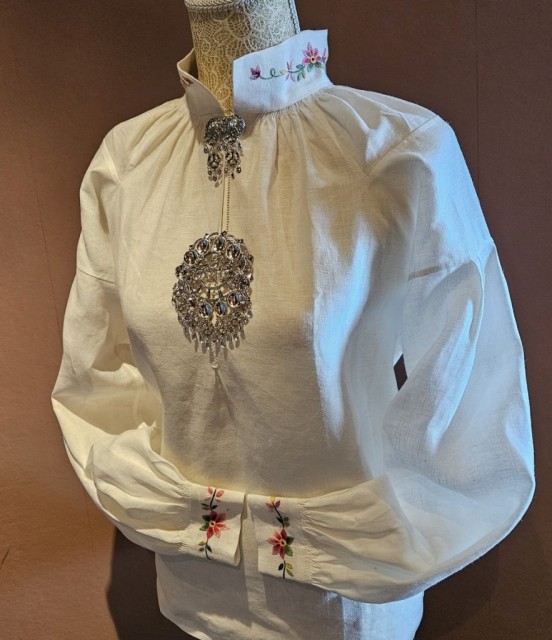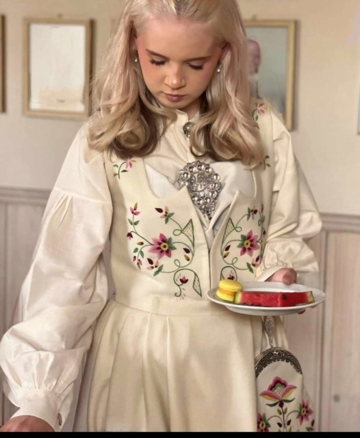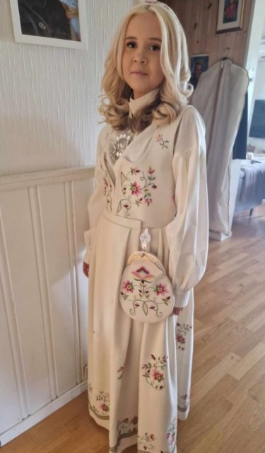 Lundeby Bunaden blir laget i klede fra Gudbrandsdalen uldvarefabrikk og brodert med garn fra Rauma.