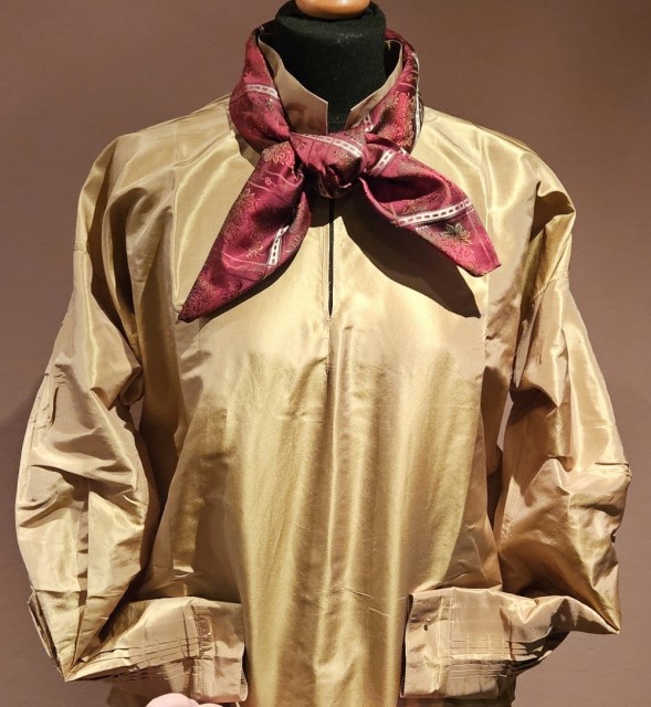 Silkeskjorte Gull, med flotte detaljer på arm og mansjett, design Tones Bunadstue