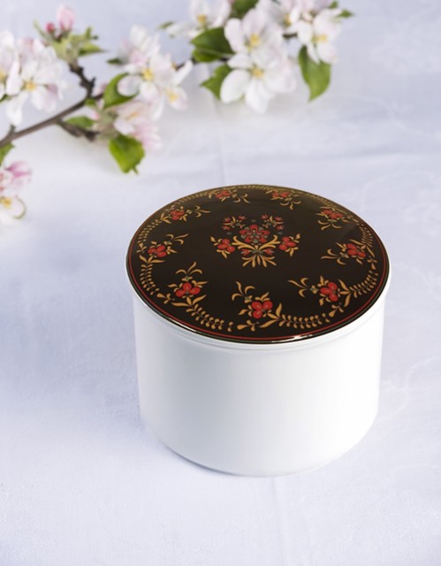 Porselen smykkeskrin med innvendig lufttett skrin i 3 etasjer. Til fest er det veldig koselig å sette skrinet på bordet med småkaker/smågodt i. Koselig og praktisk gave og gi å få !!