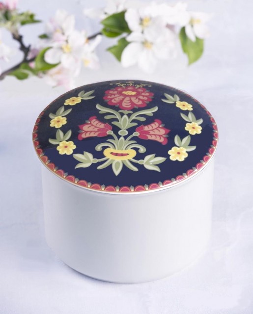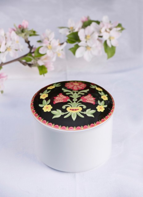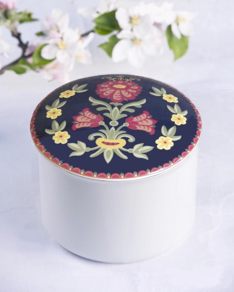 Porselen smykkeskrin med innvendig lufttett skrin i 3 etasjer. Til fest er det veldig koselig å sette skrinet på bordet med småkaker/smågodt i. Koselig og praktisk gave og gi å få !!