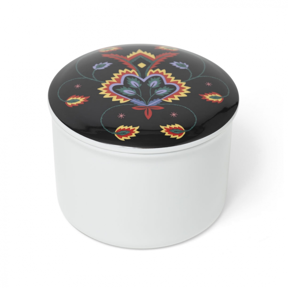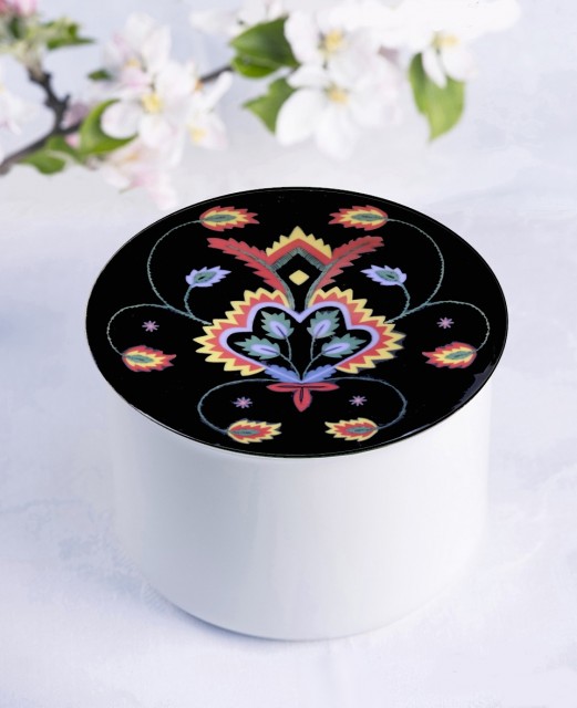 Porselen smykkeskrin med innvendig lufttett skrin i 3 etasjer. Til fest er det koselig å sette skrinet på bordet med småkaker/smågodt i. Mål 11cm, diameter 14,5cm, Koselig gave å gi og få!