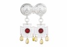 Hvit forgyldt 830s. Pakken inneholder sølje. 3 par borer, halssølje, ørepynt, beltespenne og mansjettknapper