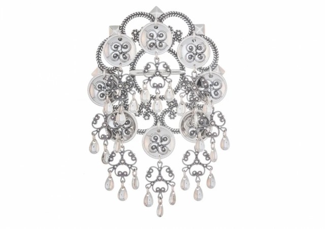 Pakken inneholder brystsølje, halssølje, beltespenne, mansjettknapper , kjede med spyd og lauv, øredobber, hekter, ring og sjalfeste. Fra kvalitetsleverandøren Vossasylv