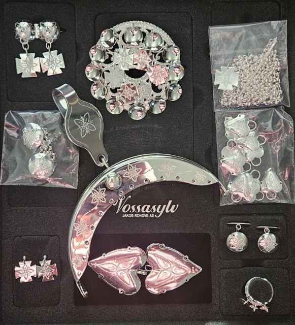 Rogaland- sølv i sett, gravert hvit med veskelås, Vossasylv