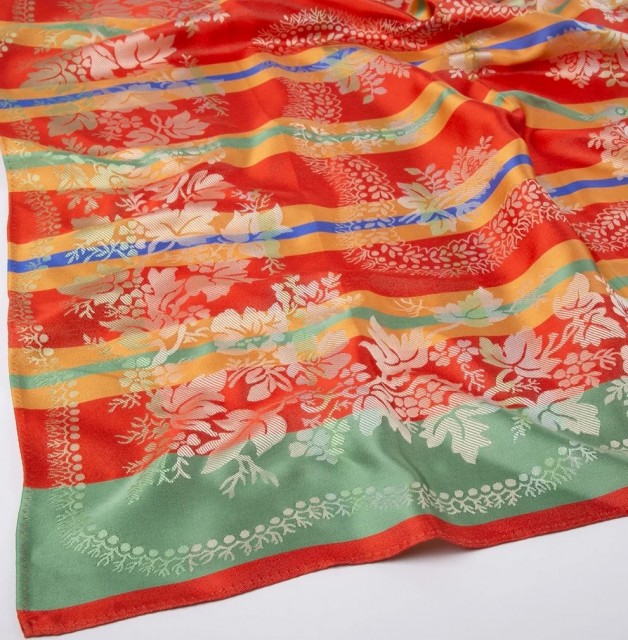Silkeskjerf brukes til bunader og festdrakter over hele landet, men passer like godt som en "fargeklatt" for antrekk i hverdagen Det har blitt veldig populært å style opp bunaden med silkeskjerf. Str 75x75 cm