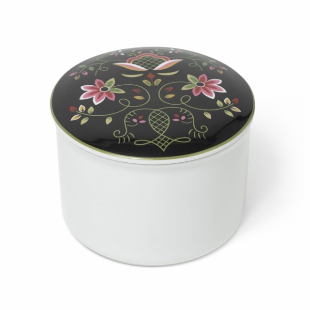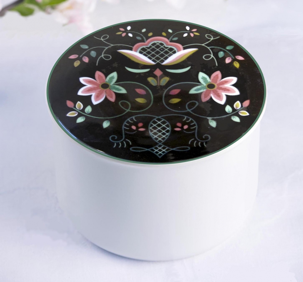 Porselen smykkeskrin med innvendig lufttett skrin i 3 etasjer. Til fest er det koselig å settes skrinet på bordet med småkaker/smågodt i. Mål 11cm, diameter 14,5cm. Kjempeflott gave!!