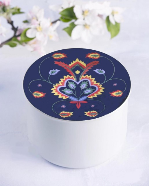 Porselen smykkeskrin med innvendig lufttett skrin i 3 etasjer. Til fest er det koselig å sette skrinet på bordet med småkaker/smågodt i. Mål 11cm, diameter 14,5cm, Koselig gave å gi og få!